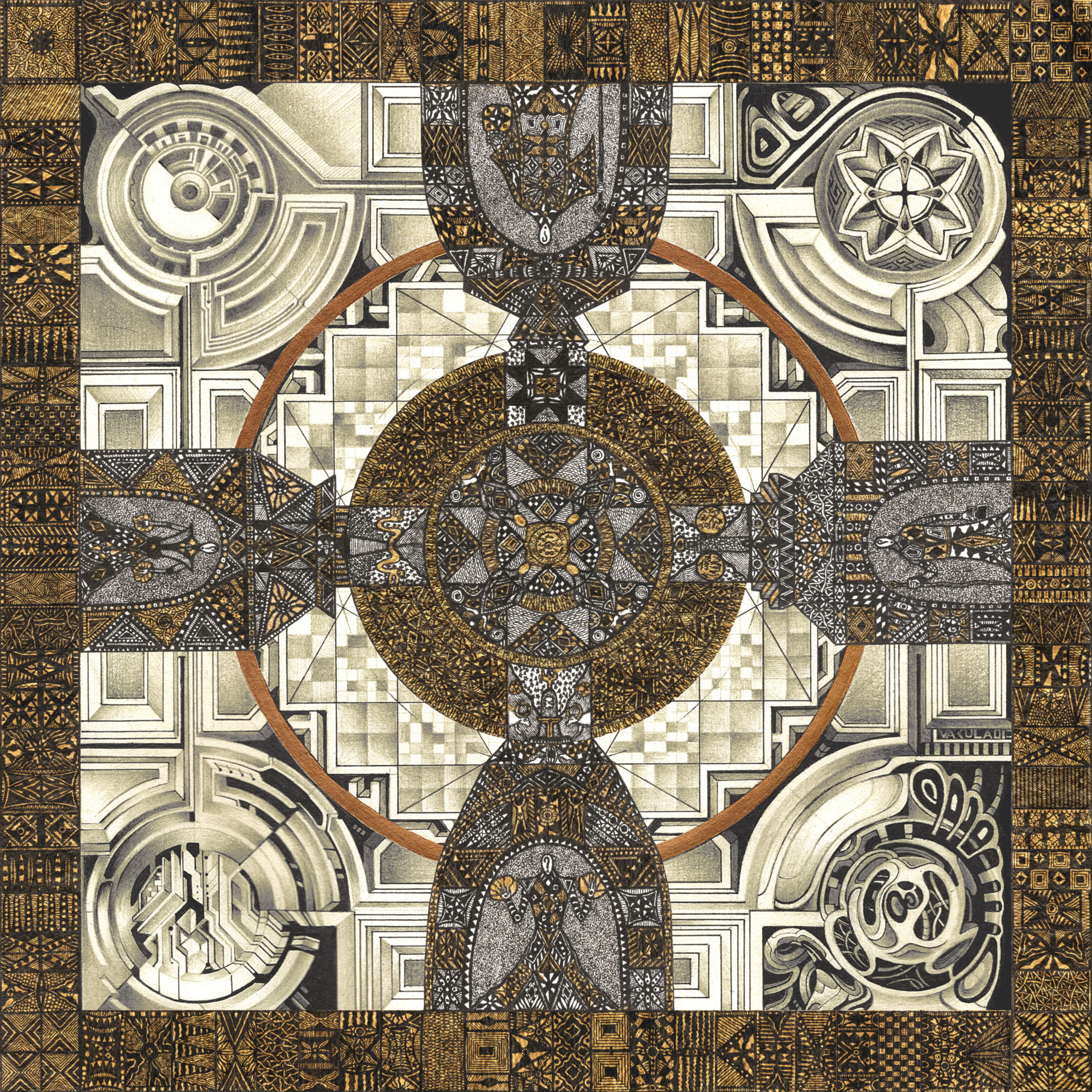 '108 Mysteries' is a double vinyl comprising 9 tracks created by Vakula at his studio, mostly by the artist himself, few in collaboration with the vocalist Amrita Ananda and other artists.