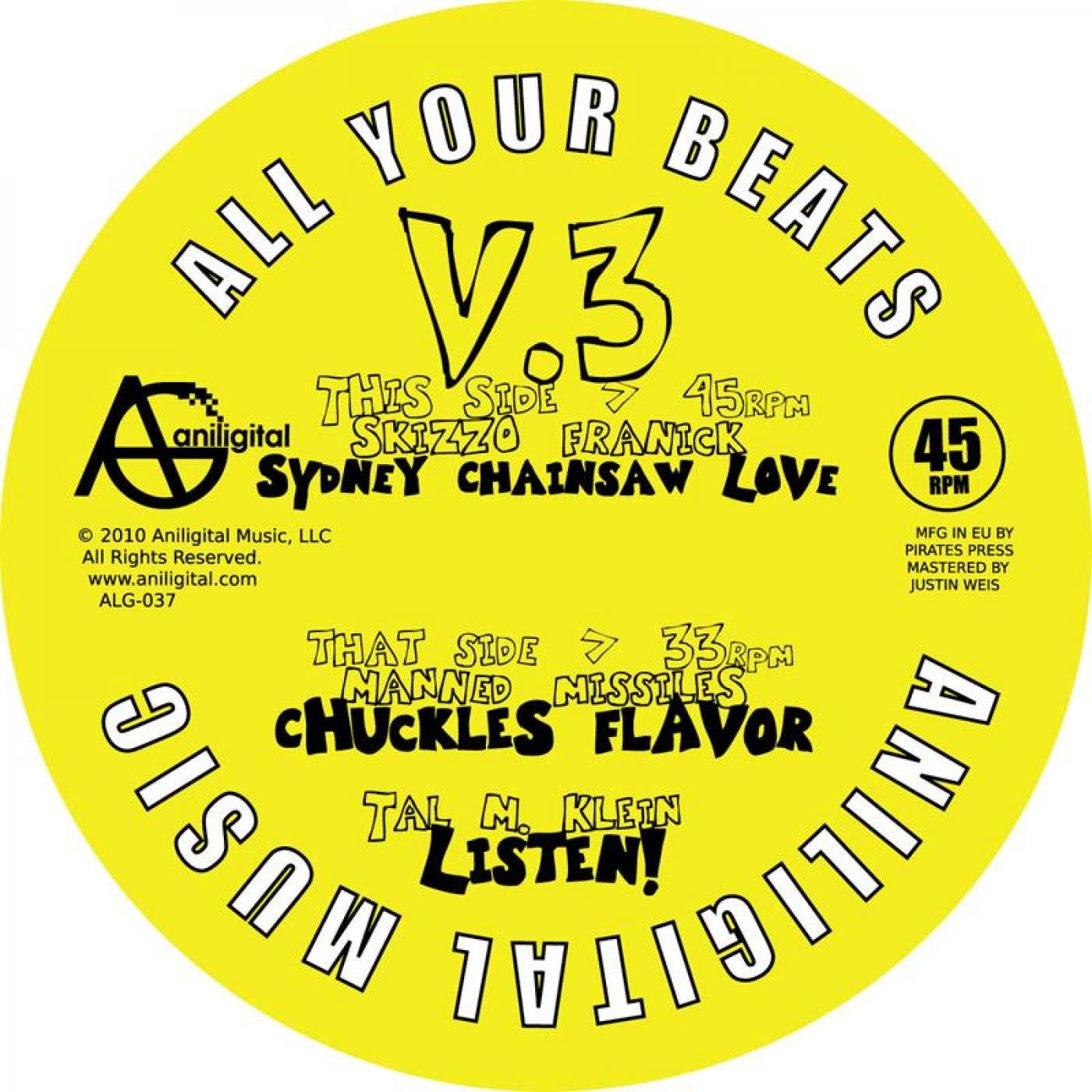 In 2003 Aniligital Music released our first 'All Your Beats' compilation. Featuring the very best funky left field beats from Tal M. Klein (then known as Trancenden), Skizzo Franick, and Cleo's Apartment (whose founder, Jazzcop now released music as solo project he calls Manned Missiles). The compilation was a hit and we came back three years later with an acclaimed second volume. Now, in 2010 'All Your Beats' is coming back featuring fresh new material from our core team of producers.